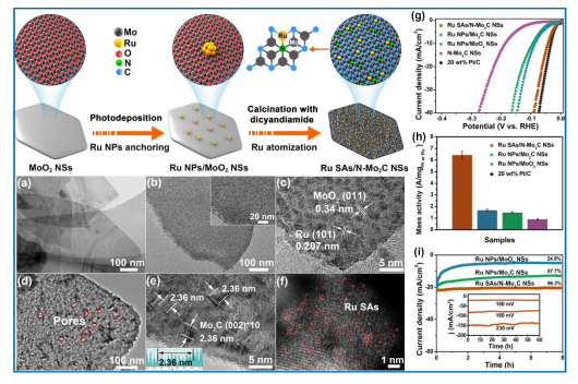 由于MoO2 NSs納米片具有超薄結(jié)構(gòu)的二維結(jié)構(gòu),因此有利于暴露Mo活性位。基于此,如圖4所示,本工作以MoO2 NSs為前驅(qū)體,通過一步煅燒實(shí)現(xiàn)原位相轉(zhuǎn)化為超薄N摻雜Mo2C納米片(N-Mo2C NSs)作為陰極產(chǎn)氫催化劑。通過測試分析研究了厚度約1.1 nm的MoO2 NSs和厚度約1.0 nm的N-Mo2C NSs的晶相和結(jié)構(gòu)的轉(zhuǎn)變過程。 結(jié)構(gòu)分析清楚地表明,N-Mo2C NSs的表面被頂端Mo原子所包圍,因此提供了理想的催化劑原型,在HER催化過程中具有高活性的Mo原子得到充分的暴露。理論計(jì)算表明,納米片結(jié)構(gòu),N摻雜以及Mo2C的特定晶相會(huì)產(chǎn)生更多暴露的Mo活性位,包括C平面上的Mo原子和N摻雜的原子。電化學(xué)測試表明,N-Mo2C NSs具有優(yōu)異的HER活性,起始電位為-48.3 mV,Tafel斜率為44.5 mV dec-1,在10 mA cm-2的電流密度下對應(yīng)的過電位為99 mV。 并且具有良好的長期穩(wěn)定性。相關(guān)結(jié)果發(fā)表在ACS Nano, 2017, 11, 12509。Ultrathin NDoped Mo2C Nanosheets with Exposed Active Sites as Efficient Electrocatalyst for Hydrogen Evolution Reactions,ACS Nano, 2017, 11, 12509。[研究成果四] 基于MoO2超薄二維結(jié)構(gòu)的原位相轉(zhuǎn)化為N-Mo2C同時(shí)合成單原子Ru及電解水產(chǎn)氫性能研究▲圖5. 反向奧斯特瓦爾德熟化合成N-Mo2C納米片錨定Ru單原子用于高效析氫反應(yīng)。