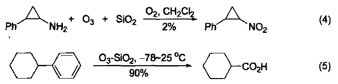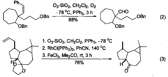 臭氧-硅膠是一種很強(qiáng)的氧化試劑,可以提供高濃度的臭氧,能夠氧化C-H鍵和許多富電子基團(tuán)[1]。 干法臭氧化最多的用途是進(jìn)行飽和環(huán)烴中叔碳上氫的羥基化。該方法不僅能保持構(gòu)象,而且具有較高的區(qū)域選擇性。但作用于鏈狀烴時,常會由于碳-碳鍵斷裂而生成大量的酮。多環(huán)烴中橋頭碳的羥基化、萜類化合物的衍生化、甾體的衍生化都能夠通過干法臭氧化來完成。此外,該方法還可以用于進(jìn)行環(huán)丙基烴α-位的官能團(tuán)化,生成環(huán)丙基烷基酮。其中,環(huán)丙基的α-位比叔碳原子優(yōu)先發(fā)生反應(yīng)(式1)[2]。 烯烴經(jīng)硅膠上的臭氧分解能有效地形成臭氧化物,根據(jù)后處理條件和后續(xù)反應(yīng)的不同往往可以得到醛(式 2)[3] 、酮[4]或者烷烴(式3)[5]等產(chǎn)物。炔烴的干法臭氧化一般斷裂為羧酸和羰基化合物,但有時也會有二酮類產(chǎn)物生成[6]。 脂肪族伯胺經(jīng)過干法臭氧化能夠生成相應(yīng)的硝基化合物(式4)[7] ,但產(chǎn)率卻并不高。苯環(huán)可以經(jīng)過干法臭氧化能夠斷裂為羧酸(式5)[8] ,這比用氧化釕氧化的產(chǎn)率要高出很多。 干法臭氧化的改進(jìn)方法是用微波釋放出 He-O2 或者 He - CO2 氣流產(chǎn) 生基態(tài)氧原子[O(3p )原子]。當(dāng)氣流通過吸附有底物的硅膠或者硅酸鎂載體 時,能夠與吸附劑上的氧結(jié)合緩慢形成臭氧。然后,臭氧再與載體吸收的 有機(jī)底物發(fā)生反應(yīng)。這個方法不僅比傳統(tǒng)的干法臭氧化方法溫和,而且還 可以區(qū)域選擇性地臭氧化具有較高不飽和度的化合物或者部分氧化斷裂多 環(huán)芳香化合物。 參考文獻(xiàn) 1. Clark, J. H.; Kybett, A. P,; Macquarrie, D. J. Supported Reagents VCH: New York, 1992, pp 44-46. 2. Proksch, E.; de Meijere, A. Angew. Chem., Int. Ed. 1976,15, 761. 3. Taber, D. F.; He, Y. G.; Xu, M. J. Am. Chem. Soc. 2004,126, 13900.