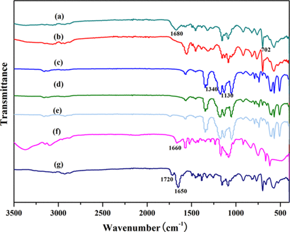 圖2. (a)Cat-1,(b)Cat-2,(c)Cat-3,(d)Cat-4,(e)Cat-5,(f)共聚物1和(g)共聚物2的FT-IR光譜