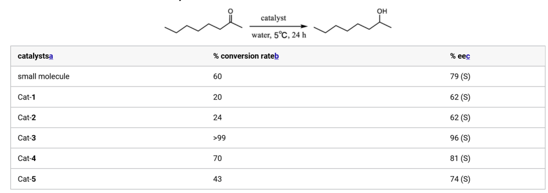 隨后,研究人員以HCO2Na作為氫源,2-辛酮作為底物對催化劑的催化性能進(jìn)行了測試,發(fā)現(xiàn)在催化劑1-5中催化劑3明顯具有最高活性與高轉(zhuǎn)化率,并且與小分子催化劑相比,催化劑3的高活性與高效選擇性依然明顯。