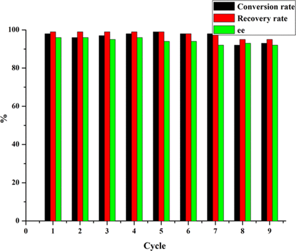 通過有機溶劑萃取實現(xiàn)催化劑與產(chǎn)物的分離,催化劑可立即用于下一個循環(huán),即使將Cat-3循環(huán)9次后,Cat-3對2-辛酮氫化反應(yīng)的催化活性和選擇性也沒有顯著降低,表明其具有高催化活性。并且與催化之前和循環(huán)9次后的紅外和XPS結(jié)果進(jìn)行對比,相應(yīng)的振動吸收峰和元素含量沒有明顯變化,表明催化劑具有穩(wěn)定的結(jié)構(gòu)。與先前報道的釕手性催化劑相比,Cat-3具有更高的活性和穩(wěn)定性。