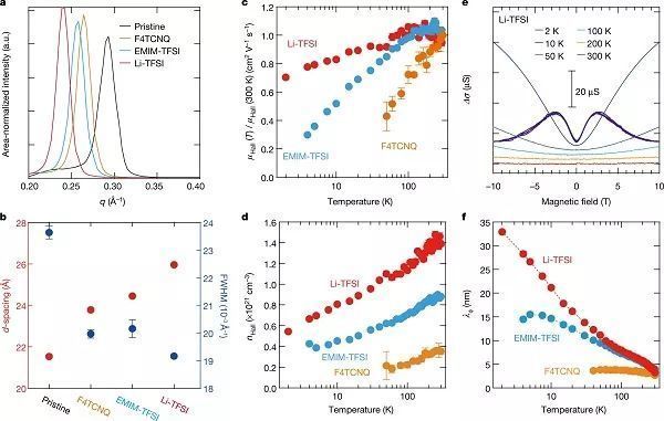 圖三、不同陰離子交換和摻雜濃度與離子相互作用的關(guān)系(a)使用各種Y-陰離子進(jìn)行交換摻雜PBTTT薄膜的光學(xué)吸收光譜;(b)使用各種X+陽離子進(jìn)行交換摻雜PBTTT薄膜的光學(xué)吸收光譜;(c)摻雜陰離子交換的PBTTT薄膜電導(dǎo)率的變化;圖四、摻雜PBTTT中的高度有序結(jié)構(gòu)和相干電荷傳輸(a)PBTTT薄膜沿面外方向的面積歸一化X射線衍射圖;(b)(100)散射峰的d-間距和FWHM值的變化;(e)磁場對不同溫度下Li-TFSI摻雜薄膜的差分薄片電導(dǎo)率的影響;