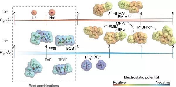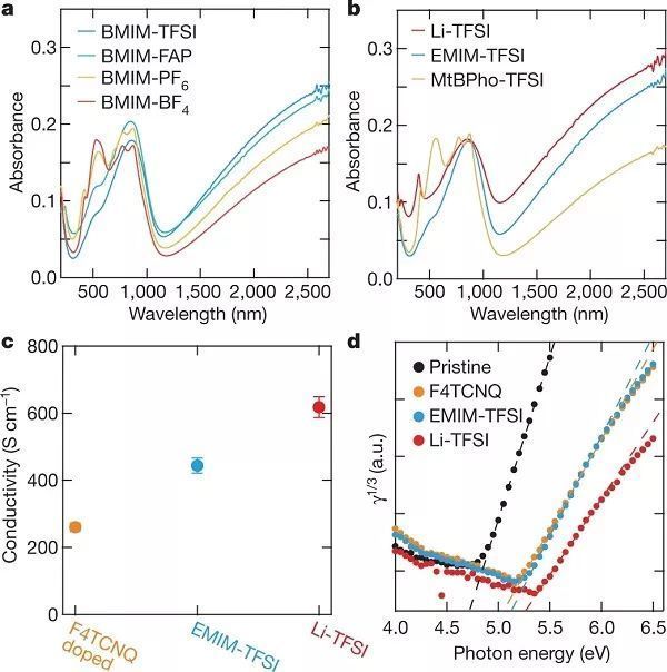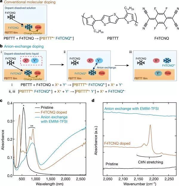 π-共軛材料的化學(xué)摻雜涉及主體和摻雜劑之間的氧化還原反應(yīng)。在該過程中,整數(shù)個電子在基態(tài)從主體轉(zhuǎn)移到摻雜劑。由于供體-受體締合的驅(qū)動力主要由π-共軛材料和摻雜劑之間的電化學(xué)氧化還原電位決定,所以僅當(dāng)電荷轉(zhuǎn)移在能量上有利時才會發(fā)生有效的摻雜。因此,為了實(shí)現(xiàn)更高的摻雜效率,摻雜劑的電子親和力需要匹配或超過主體材料的電離電勢。雖然調(diào)節(jié)各種共軛分子的電子親和力可以促進(jìn)有效摻雜,但是增加電子親和力經(jīng)常出現(xiàn)化學(xué)不穩(wěn)定性。因而需要擴(kuò)大潛在分子摻雜劑的選擇范圍。此外,在p型摻雜的情況下,空穴與空穴、空穴與反離子之間的庫侖相互作用對有機(jī)半導(dǎo)體摻雜也有明顯的影響。 針對上述問題,日本東京大學(xué)的Shun Watanabe教授(通訊作者)團(tuán)隊(duì)報道了一種利用陰離子交換來克服聚合物半導(dǎo)體摻雜過程中電荷轉(zhuǎn)移限制的方法。作者利用噻吩類共軛聚合物聚-PBTTT與四氟四氰基喹啉并二甲烷(F4TCNQ)作為主體,向供體-受體體系外加陰離子。加入的陰離子與F4TCNQ自由基陰離子自發(fā)進(jìn)行交換,交換效率基本一致。該方法使得聚合物半導(dǎo)體的摻雜水平和摻雜后形成材料的熱穩(wěn)定性都顯著被改善。該過程是由離子液體溶劑介導(dǎo),即傳統(tǒng)的小p型摻雜劑陰離子與離子液體提供的第二個陰離子的有效瞬時交換。將優(yōu)化的離子鹽(離子液體溶劑)引入到傳統(tǒng)的二元供體-受體體系中,可以克服氧化還原電位的限制,并使陰離子交換效率接近100%。因此,每個單體單元的摻雜水平可以達(dá)到幾乎一個電荷。這種摻雜水平的提高,提高了材料的穩(wěn)定性和傳輸性能。此外,陰離子交換摻雜幾乎可以使用所有的離子鹽,為聚合物半導(dǎo)體摻雜提供新思路。相關(guān)工作以題目為“Efficient molecular doping of polymeric semiconductors driven by anion exchange”發(fā)表在Nature上。(a-b)常規(guī)分子摻雜和陰離子交換法摻雜的示意圖;(c-d)原始PBTTT(黑色)、F4TCNQ摻雜的PBTTT(橙色)和通過陰離子交換法(藍(lán)色)摻雜的PBTTT的光吸收和FTIR光譜。圖二、陽離子和陰離子的分子結(jié)構(gòu)和靜電勢圖