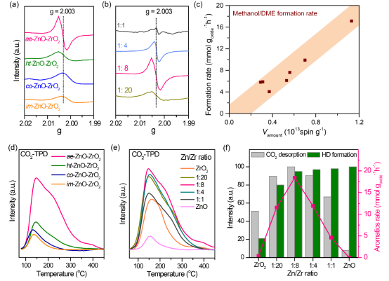 H2 的活化也是反應(yīng)中十分重要的一個(gè)環(huán)節(jié),對(duì)于芳烴的生成速率有明顯的影響。我們通過(guò) H2-D2 交換實(shí)驗(yàn),考察了具有不同 Zn/Zr 比 ZnO-ZrO2 的 H2 活化能力,發(fā)現(xiàn)純 ZrO2 基本無(wú)法活化 H2,而隨著 Zn 含量的增加,ZnO-ZrO2 的 H2 活化能力明顯增強(qiáng),因此我們認(rèn)為 Zn 主要作用是促進(jìn) H2 的活化。▲圖3. (a, b) 不同制備方法和 Zn/Zr 比催化劑的 EPR 表征結(jié)果. (c) CH3OH/DME 生成速率與氧空位密度關(guān)系. (d, e) 不同制備方法和 Zn/Zr 比催化劑 CO2-TPD 表征結(jié)果. (f) 芳烴生成速率與混合氧化物上吸附 CO2 量和活化氫氣能力的關(guān)系.