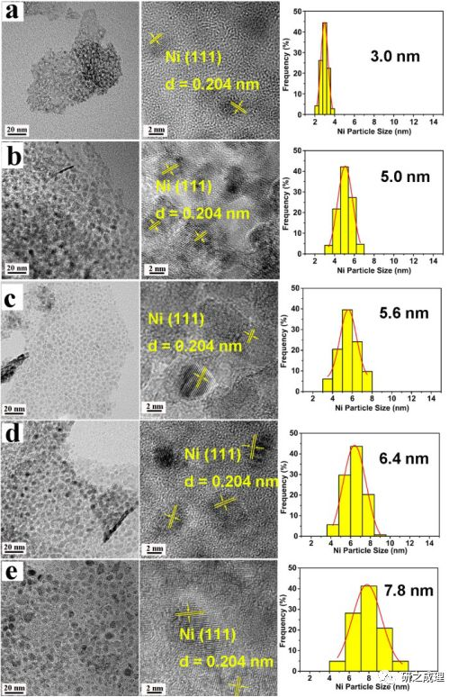 ▲Figure 2. TEM images, HRTEM images, and size distribution of metallicNiparticleforNi-NiAl-LDO prepared by calcination under H2 atmosphere at 400 oCof(a) Ni1.08Al-LDHs for 1 min, (b) Ni2.01Al-LDHs for 1h, (c) Ni2.98Al-LDHs for 1.5h,(d) Ni3.97Al-LDHs for 2.0h, and (e) Ni5.03Al-LDHs for 2.5 h.