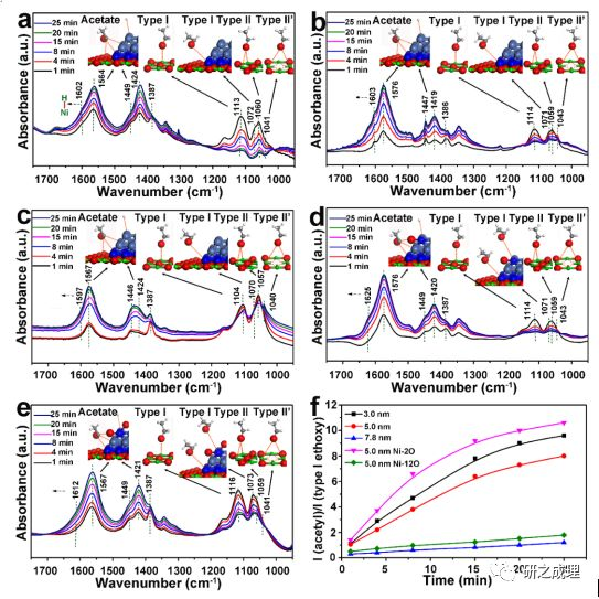 ▲Figure 4. OperandoFT-IR spectra recorded during the reaction of adsorbed ethanol at 120 °C under vacuum conditions for (a) 3.0nmNi-NiAl-LDO, (b) 5.0nmNi-NiAl-LDO, (c) 7.8nmNi-NiAl-LDO, and 5.0nmNi-NiAl-LDO treated with (d) 2mLand (e) 12mLof O2. (f) The intensity ratio of acetyl (1576 cm-1) to type I ethoxy (1070-1073 cm-1) absorption on Nid+ sites as a function of time. Ethanol activation models are shownin the inserts. The red, blue, green, white, gray-blue, and gray spheres and the red dotted circle represent the O, Nid+, Ni2+, H, Ni0, C, and O vacancies, respectively.
