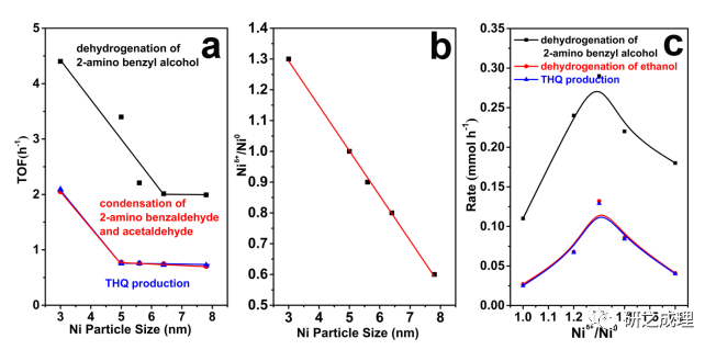 ▲Figure3.(a) Profiles of turnover or product frequency as a function of Ni particle size. (b) ProfilesofNiδ+/Ni0 as a function of Ni particle size. (c) Conversion rate for 2-amino benzyl alcohol/2-amino benzaldehyde and formation rate for THQ vs the ratio ofsurfaceNid+ to Ni0.