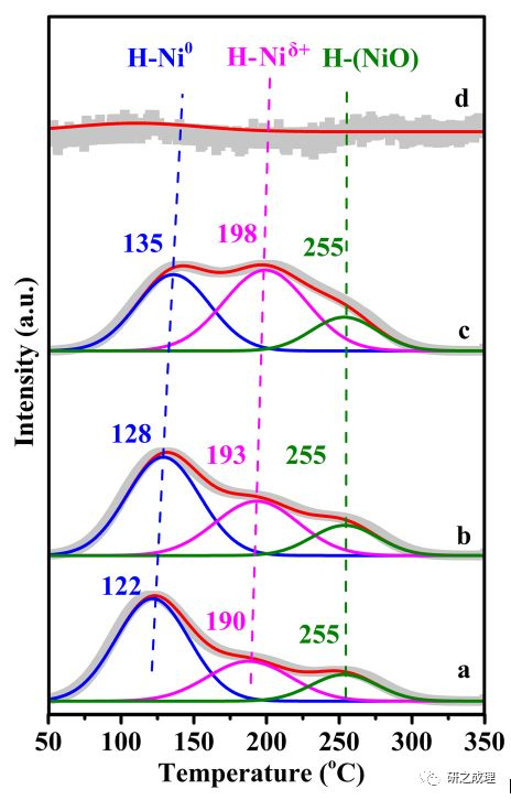 ▲Figure 5. H2-TPDprofilesfor 5.0nmNi-NiAl-LDO before (a) and after treatment with 2mL(b) or 12mL (c) of O2 and (d) on NiAl-LDO.