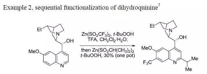 Baran試劑對喹啉的兩個氫連續進行官能團化。