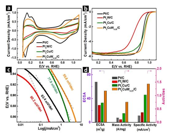 ▲Figure 2. (a) Cyclic voltammograms (CV) and (b) ORR polarization curves of 20 wt% Pt/C, Pt2W/C, Pt2Cu/C and Pt2CuW0.25/C, (c) SAs for Tafel plots for electrocatalysts, (d) Summary of ECSAs, SAs and MAs.
