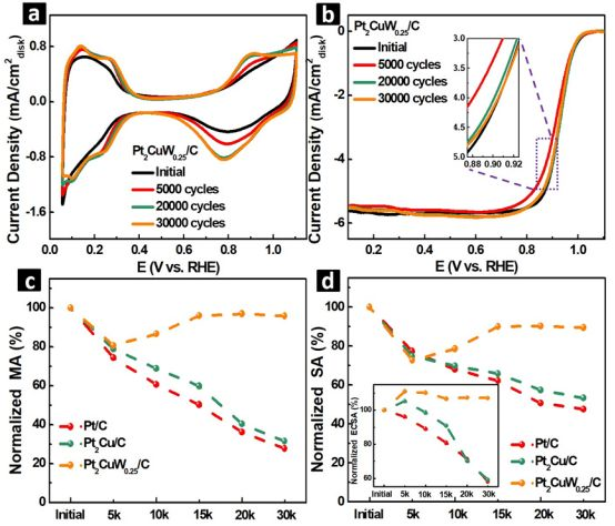 ▲Figure 3. (a) Cyclic voltammograms and (b) ORR polarization curves of the Pt2CuW0.25/C after 10k, 20k and 30k cycles of polarization. (c) MA and (d) SA evolutions of Pt/C, Pt2Cu/C and Pt2CuW0.25/C at different cycles compared with the initial values (in percentage). Inset: Evolution of ECSA.
