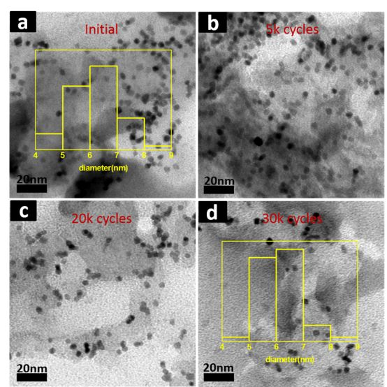 ▲Figure 4. TEM images of Pt2CuW0.25/C (a) at the beginning and after (b) 5000 cycles, (c) 20000 cycles, and (d) 30000 cycles.