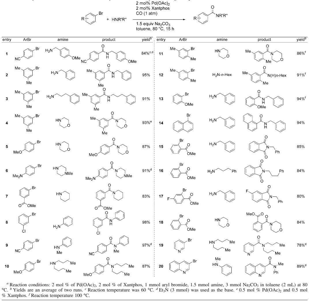 很多時候我們設(shè)計(jì)路線的時候,往往會先制備酯,再水解為酸,再縮合,三步反應(yīng)制備酰胺。其實(shí),我們可以嘗試,溴代芳烴直接插羰制備酰胺,只要一步反應(yīng),效率和原子經(jīng)濟(jì)性都提高很多。本文催化體系在這一塊也能取得不錯的催化效果。