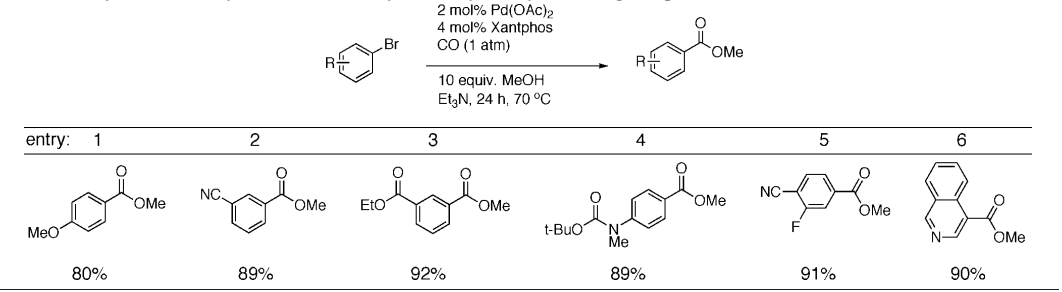 實(shí)驗(yàn)室中鈀催化鹵代芳烴,CO和親核試劑的插羰反應(yīng)是制備酯,Weinreb酰胺,酰胺類羧酸衍生物的實(shí)用和重要方法。一般情況下,我們一般在高壓條件下操作該反應(yīng),壓力較大安全需要考慮,而且操作也不是很方便。2008年,Stephen L. Buchwald團(tuán)隊(duì)報(bào)道了Pd(OAc)2/Xantphos體系催化的溴代芳烴在常壓下的插羰反應(yīng),高效制備了一系列的酯,Weinreb酰胺,酰胺類羧酸衍生物。