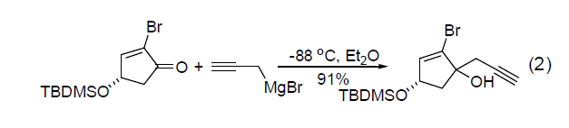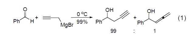 【制備和商品】商品化試劑常溶于THF 中。通常可原位制備而來。首先用金屬鎂與氯化汞反應得到鎂汞齊,進而與丙炔基溴反應即可原位得到丙炔基溴化鎂。