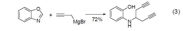 【注意事項】該試劑必須在需要時原位制備而來,它很容易水解釋放出烴類氣體,因此必須在干燥的惰性氣體保護下操作使用。該試劑放置數日后會發生歧化反應,得到丙炔、丙二烯和炔基格氏試劑混合物。