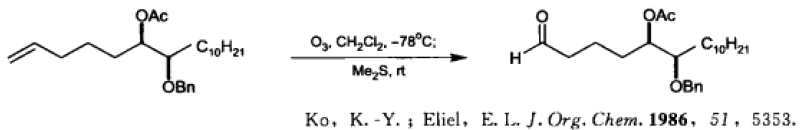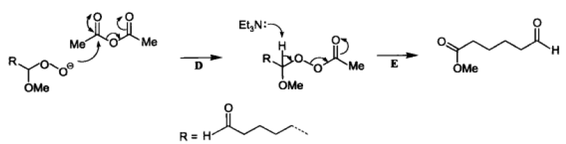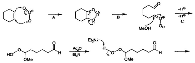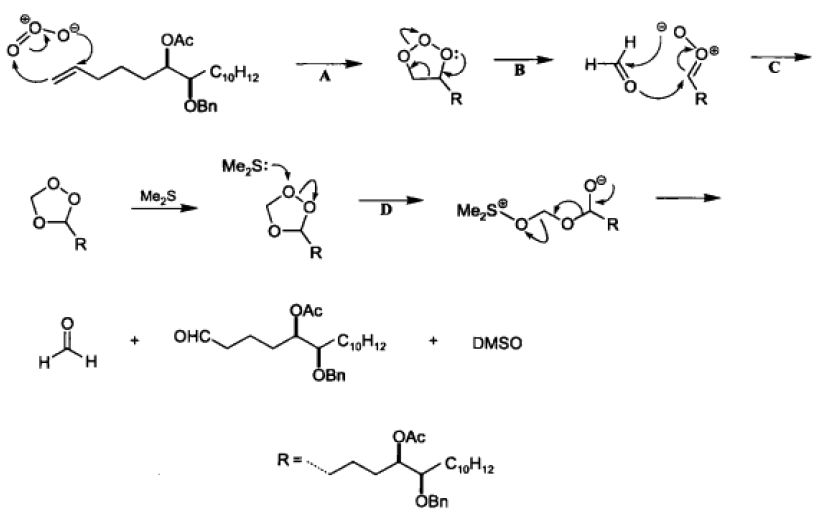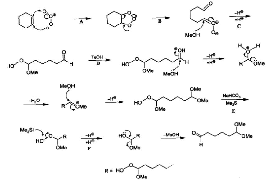 反應(yīng)實例二 反應(yīng)說明:該反應(yīng)是環(huán)烯烴被臭氧氧化開環(huán)生成一端是醛一端是酯的反應(yīng) 反應(yīng)機理 A:臭氧對烯烴的1,3-偶極環(huán)化 B:雜環(huán)裂解 C:用甲醇處理偶極化合物形成過氧化物 D:乙酰化 E:加入三乙胺以去質(zhì)子化,從而消去一分子乙酸得到產(chǎn)物 反應(yīng)實例三 反應(yīng)說明:該反應(yīng)是鏈式烯烴被臭氧氧化裂解生成醛酮的反應(yīng) 反應(yīng)機理 A:臭氧與烯烴發(fā)生1,3-偶極環(huán)化反應(yīng) B:雜環(huán)裂解 C:分裂后的1,3-偶極化合物與醛進行再結(jié)合生成新的臭氧化物 D:在二甲硫醚的作用下還原裂解臭氧化物的氧-氧鍵