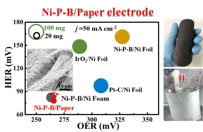 高效、低成本催化電極的構(gòu)建是其大規(guī)模應(yīng)用的關(guān)鍵。本研究使用常見、易得的基底材料(紙、海綿及布),借助簡單的化學(xué)鍍方法,將導(dǎo)電催化劑均勻沉積于其表面,制備出了具有高效、經(jīng)濟、輕質(zhì)、可折疊等優(yōu)點的新型催化電極。其中,使用濾紙構(gòu)筑的 Ni-P-B/Paper 電極在1M堿性電解液中實現(xiàn)了高效的析氫(η500=276mV)與析氧反應(yīng)(η500=375mV),并在1A/cm2 大電流密度下可穩(wěn)定工作 240 h 以上,其性能優(yōu)于相同催化材料的金屬基底電極,具有潛在的實用價值。