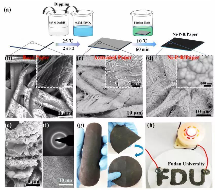 ▲圖1 a)紙片電極的制備過程;b-d)分別為空白紙片、活化紙片以及 Ni-P-B/紙片電極的 SEM 圖;e)Ni-P-B/Paper 電極的側(cè)面圖;f)HRTEM 圖;g)直徑 12cm 的催化電極圖;h)電極導(dǎo)電性圖
