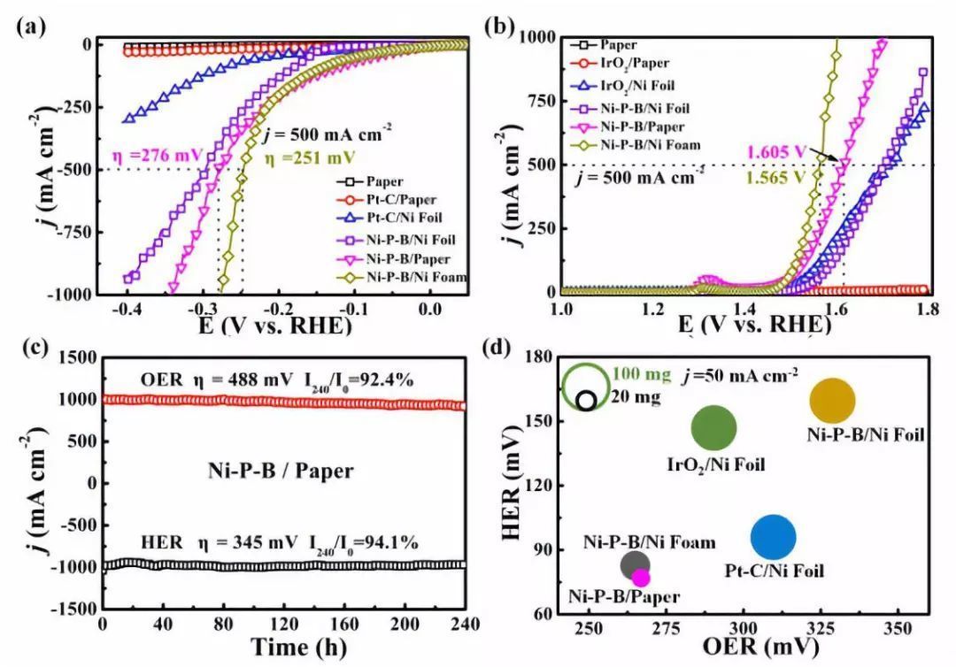 所制備 Ni-P-B/紙電極,相較于商業(yè)的 Pt-C、IrO2 以及同樣條件下使用金屬 Ni Foil 以及 Ni Foam 制備的電極,顯示出了優(yōu)異的 HER 及 OER 催化性能。其在 2mV/s 的掃描速率及 500 mA/cm2 的電流密度下,經(jīng)過 iR(80 %)的矯正,析氫過電位僅為 276mV,析氧過電位僅為375mV,充分顯示出紙電極優(yōu)異的性能。同時,在電流密度1 A/cm2 下,其析氫、析氧可以連續(xù)催化 240 h,且效率可保持在 90 %以上。此外,該紙片催化電極除了具有性能優(yōu)異、可彎曲、折疊變型等優(yōu)勢外,還具有質(zhì)輕的優(yōu)點,相同尺寸的電極僅為 Ni Foil 催化電極的1/5,Ni Foam催化電極的1/2(圖2示)。▲圖2 a-b)為各催化電極的 HER 及 OER 性能圖;c)Ni-P-B/Paper 電極的穩(wěn)定性圖;d)各催化電極的性能及質(zhì)量比較