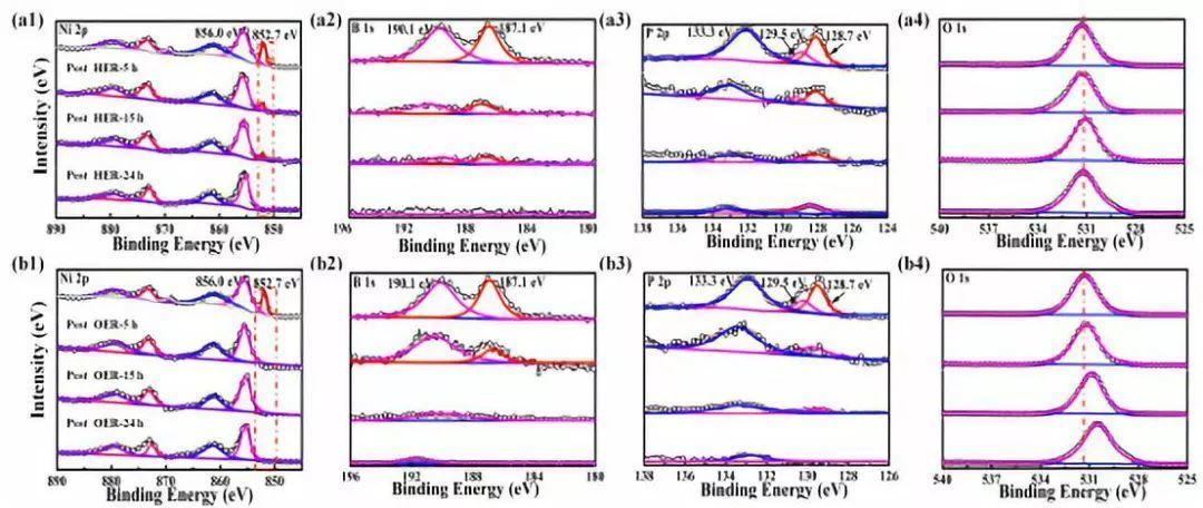 ▲圖3 a1-a4)Ni-P-B/Paper 電極各元素在 HER 過程中的 XPS 分析;b1-b4)各元素在 OER 過程中的 XPS 分析