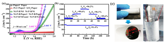 具有高效雙功能特點的 Ni-P-B/Paper 電極,可實現(xiàn)高效的全水分解。其在 1.661V 的電壓下可達到 50 mA/cm2 的電流密度,在 0.1A /cm2 下的電流密度下工作 240 h,效率仍可保持在 91.4 %。由于紙片電極的柔性特點,可設(shè)計出各種結(jié)構(gòu)類型的電極,其中單面紙電極可同步實現(xiàn)氫、氧氣體的產(chǎn)生與分離,從而提高催化制氫、制氧的效率,并降低工藝成本(圖4示)。▲圖4 a)各電極的全水分解性能圖;b)Ni-P-B/Paper電極全水分解的穩(wěn)定性圖;c)Ni-P-B/Paper 單面電極的制作與產(chǎn)氫效果圖。