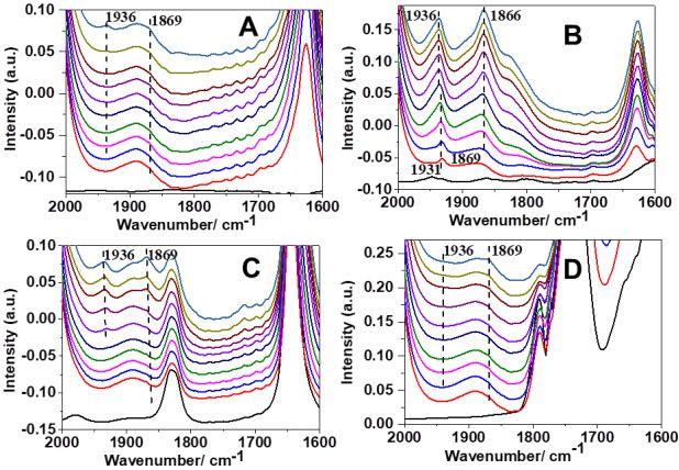 ▲Figure 4. In situ FTIR transmission spectroscopy recorded for the Co/SiO2 catalyst by introducing 5 MPa of syngas as the reaction gas after the adsorption of different volatile chemicals in a vacuum. (A) no chemical, (B) toluene, (C) 1-hexene, and (D) formic acid. From the bottom to top in each panel: 0, 0.5, 1, 2, 3, 4, 7, 10, 20, 25, and 30 min.