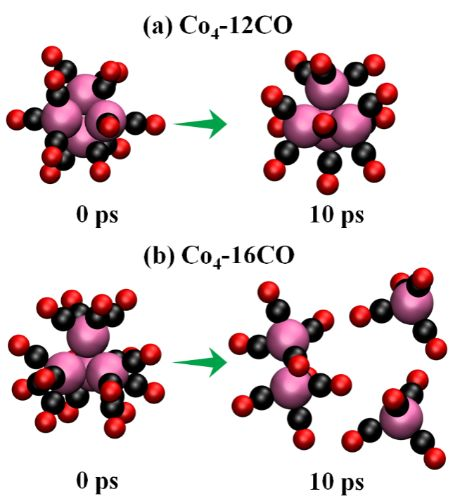 ▲Figure 6. Images of the initial and final structures at 10 ps from the AIMD simulations of (a) 12 CO and (b) 16 CO molecules adsorbed on Co4 clusters at 373 K. The Co, C, and O atoms are purple, black and red, respectively.