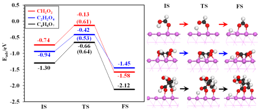 ▲Figure S13. The energy profiles as well as the corresponding structures for the IS, TS, and FS, The ordinate represents the adsorption energy of organic molecules. Numbers in the parentheses indicate the barriers. The purple, black, red, and white balls represent for Co, C, O, and H atoms, respectively.