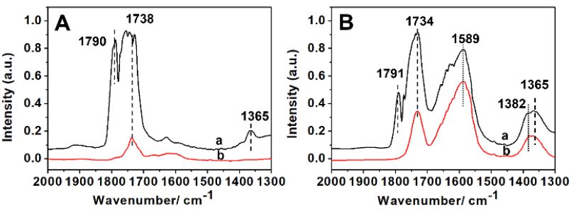 ▲Figure 5. In situ FTIR transmission spectroscopy recorded (a) after the adsorption of formic acid and then (b) desorption in the vacuum condition for 15 min over (A) SiO2 and (B) the Co/SiO2 catalyst at 100 ℃.