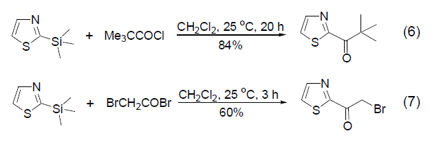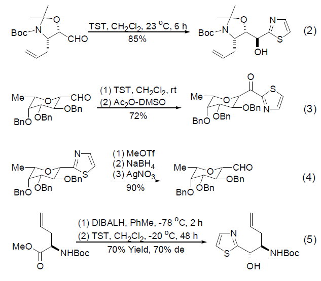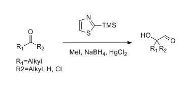 2-三甲基硅基噻唑對醛酮或酰氯進行親核反應得到羥甲基噻唑,接著通過還原水解(MeI/MeOTf ,NaBH4, HgCl2/CuCl2/CuO/AgNO3)生成醛酮或酰氯的甲酰化產物的反應。