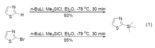 【制備和商品】該試劑為無色液體,在國際大型化學試劑公司有銷售。在實驗室可以通過噻唑在2-位鋰化后與Me3SiCl反應來制備[1]。