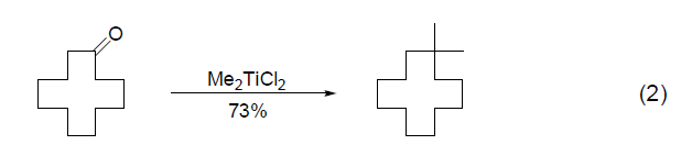 【制備和商品】二氯二甲基鈦可以通過甲基化金屬試劑如甲基鋰、甲基溴化鎂、Me2Zn 和三甲基鋁與四氯化鈦定量反應(yīng)而來。