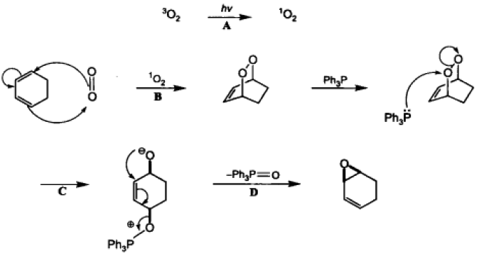 反應說明:該反應是氧氣與環己二烯發生Diels-Alder反應形成橋環化合物,然后用親核性較強的三苯基膦處理,開環得到環氧乙烷的反應