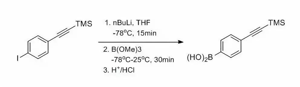 nBuLi (1.6_ in hexane, 1 mL, 1.6 mmol) at -78℃ under nitrogen was addedto a solution of 4-(trimethylsilylethynyl) iodobenzene (0.3 g, 1.13 mmol) in THF (5 mL). After stirring for 15 min at - 78℃, trimethylborate (0.2 mL, 1.6 mmol)was added in one portion. The mixture waswarmed to 25 ℃, stirred for 30 min, andquenched with dilute HCl solution. Themixture was extracted with EtOAc (20 mL), washed with water, dried (MgSO4) andevaporated to obtain the crude 4-(trimethylsilylethynyl) phenylboronic acidthat was used without further purification.