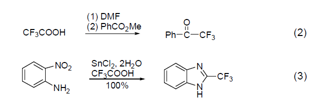 三氟甲基是親脂性好,電負(fù)性強(qiáng)的基團(tuán),它在生物活性分子中具有特殊的作用。利用三氟乙酸可以在一些化合物分子中引入三氟甲基(式2,式3)[6,7]。