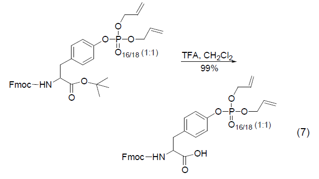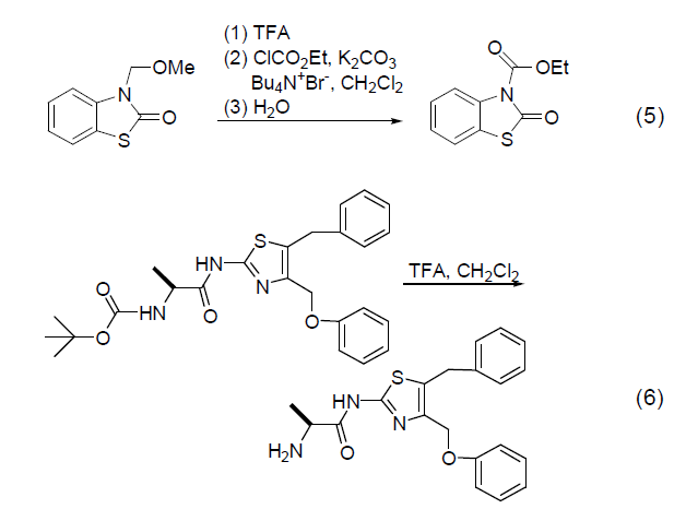 的化學(xué)基團(tuán)(如氨基、羥基等),常常需要利用一些保護(hù)基團(tuán)對(duì)其進(jìn)行保護(hù)。三氟乙酸可以比較方便地脫去氨基、羥基的保護(hù)基團(tuán)[5],例如,N-芐氧羰基、N-甲氧甲基 (式5)、N-叔丁氧羰基 (式6)[9]、O-叔丁氧羰基 (式7)[10]、N-芐氧甲基等。