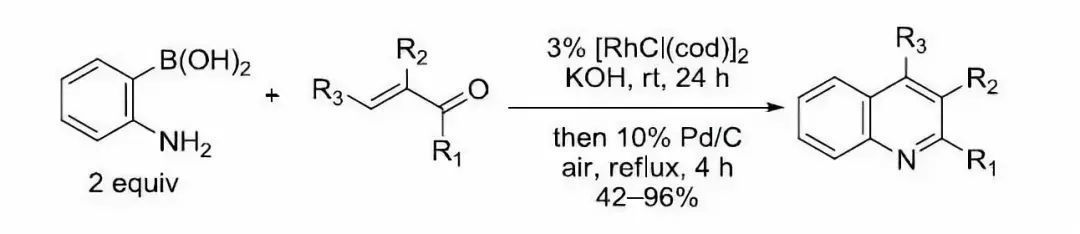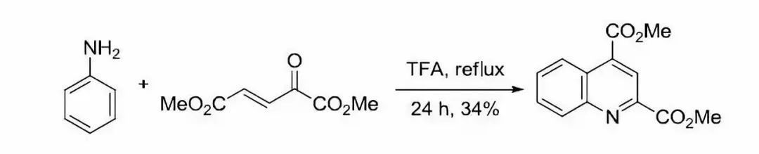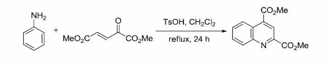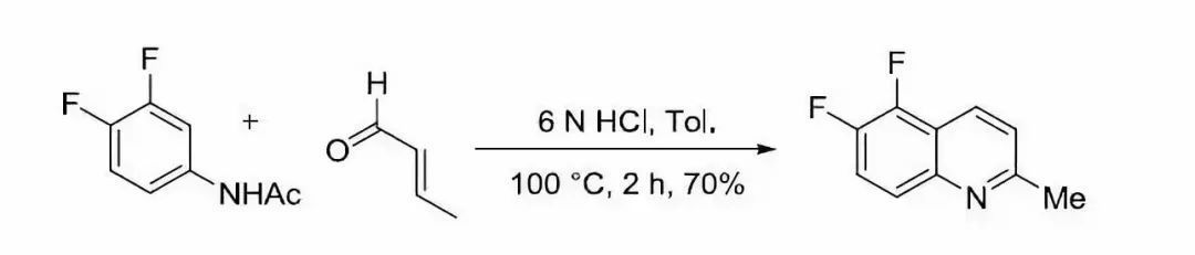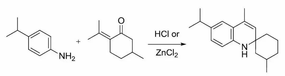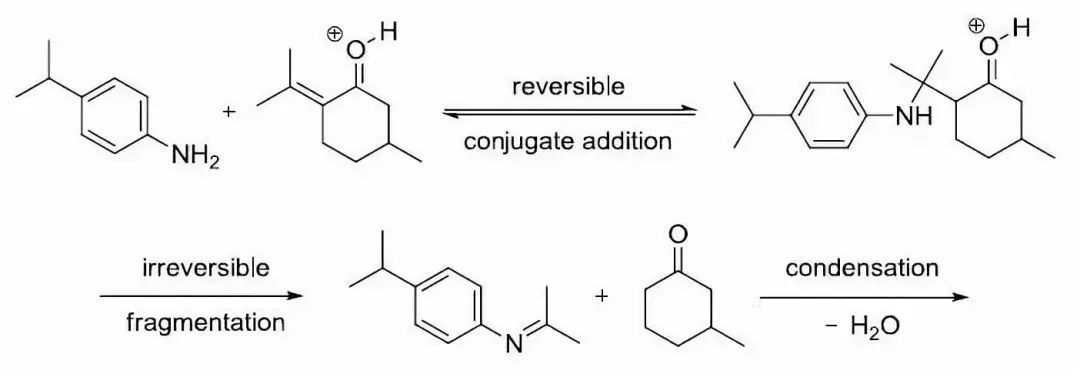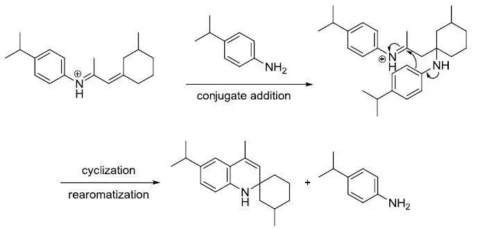 與同為喹啉合成法的Skraup反應一樣,此反應的具體機理亦有爭議。2006年 Denmark等以4-對異丙基苯胺與胡薄荷酮為原料,利用碳同位素示蹤交叉實驗的結果,提出如下機理。他們認為首先是胺對不飽和酮發生可逆的親核共軛加成,得烴胺基酮 ,然后胺基酮 不可逆裂解,生成亞胺和飽和的環己酮。上述兩個產物接下來再發生縮合,生成共軛亞胺,而共軛亞胺再受另一分子胺的親核共軛加成,得亞胺,接著進行分子內親電加成,質子轉移,消除一分子胺,苯環重新芳構化,得1,2-二氫喹啉 。 由于原料不飽和酮的遠端烯碳是二取代,不帶氫,故二氫喹啉即反應最終產物。