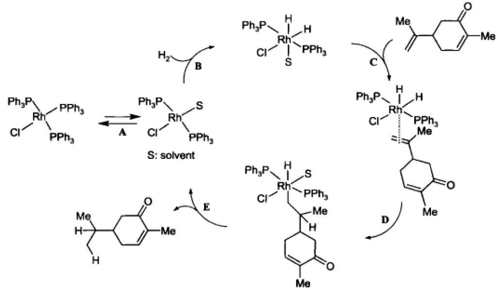 反應實例反應說明:該反應是Wilkinson絡合物均相催化選擇性加氫的反應反應機理A:配體交換B:在金屬銠上氧化加氫C:催化劑與烯形成配合物D:氫金屬化反應E:還原消去產物,同時催化劑復原本文摘自---有機化學反應機理