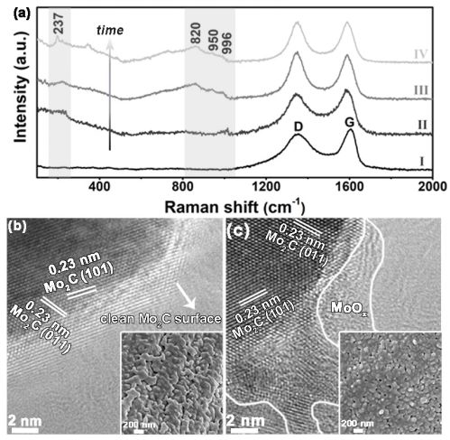 我們首先通過有機(jī)-無機(jī)前驅(qū)體高溫?zé)峤獾姆椒ǎ谔疾迹–C)表面生長 Mo2C 納米顆粒;再經(jīng) O2 氣氛下等離子處理,可控形成表面氧化層(MoOx)。如 Figure 1 所示,隨著處理時間延長,Raman 光譜中逐漸出現(xiàn) MoO3 的特征峰(996,950,820 和 237 cm-1)。同時,TEM 中也觀察到 Mo2C 表面覆蓋無定形氧化層。▲Figure 1. (a) Raman spectra of (I) fresh-made Mo2C/CC and Mo2C-MoOx/CC after surface oxidation for various time (II: 1 min, III: 2 min, and IV: 3 min). HR-TEM images of (b) Mo2C/CC and (c) Mo2C-MoOx/CC(2). Insets of (b) and (c) present SEM images.