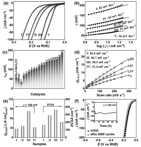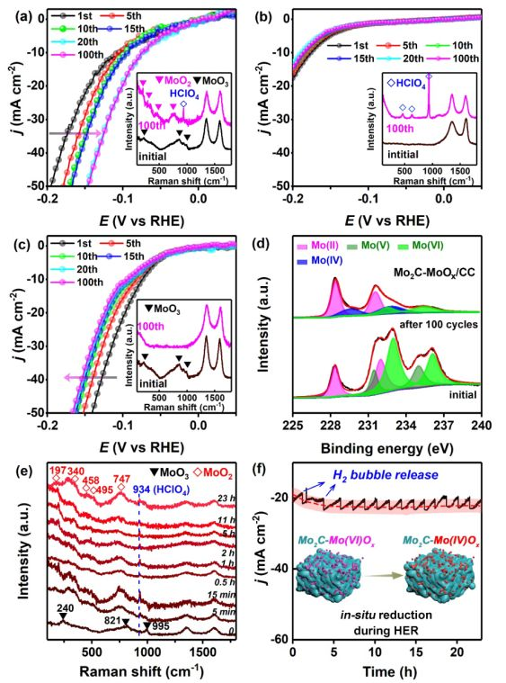 ▲Figure 2. Polarization curves (without iR correction) of (a) Mo2C-MoOx/CC(2) and (b) Mo2C/CC in 1.0 M HClO4, and (c) Mo2C-MoOx/CC(2) in 1.0 M KOH. (d) XPS profiles of Mo 3d of Mo2C-MoOx/CC(2) before and after cycling test in 1.0 M HClO4. (e) in-situ Raman spectra with (f) chronoamperometry curve at η = 200 mV in 0.1 M HClO4 (without iR correction). The i-t curve in f is not smooth because of H2 bubble formation and release from the electrode. The insets of (a), (b) and (c) present the corresponding Raman spectra before and after HER test.