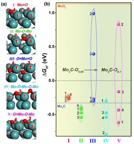 DFT 計算解釋了 Mo2C-MoOx 表面重構(gòu)如何提高 HER 活性。如Figure 3 所示,單一的 Mo2C 有著較負(fù)的 DGH*,H* 難以脫附。在不同表面氧化程度的 Mo2C 上,DGH* 表現(xiàn)出明顯的變化,其中適中氧化程度的 Mo2C 中各個 Mo 位點的 DGH* 在熱力學(xué)上更接近零。可見,Mo(VI) 原位還原成 Mo(IV) 能夠有效降低 Mo2C-MoOx 中 O 含量,使得重構(gòu)后的異質(zhì)界面處 Mo 位點的 DGH* 在熱力學(xué)上更接近零,有效解決表面 *H 難脫附的問題,從而加速了 HER 動力學(xué)過程。同時,Mo2C 表面上與 Mo=O 相鄰的 Mo 原子極有可能是真正的析氫活性位。▲Figure 3. (a) Models of Mo2C (101) surface bonded with various oxygen species, and (b) the corresponding DGH* on surfaces sites. The chemisorption configurations are depicted in Figure S10. The Mo, C and O atoms in panel (a) are respectively displayed in cyan, grey and red.