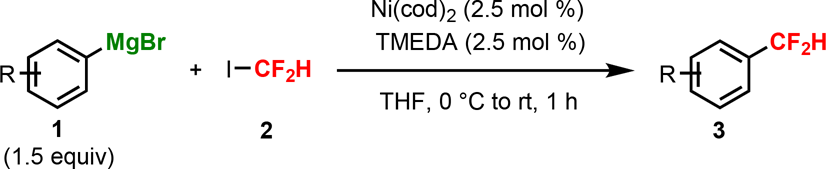 2018年,Hirotaka Motohashi和Koichi Mikami報道了在Ni(cod)2/TMEDA催化下,芳基格氏試劑和二氟碘甲烷進行交叉偶聯得到二氟甲基芳基化合物。機理研究表明,Ni(cod)2首先對二氟碘甲烷進行氧化加成得到TMEDA?Ni(II)(CF2H)I絡合物,接著通過和PhMgBr進行金屬轉移得到TMEDA?Ni(II)(CF2H)Ph,還原消除得到產物并伴隨著TMEDA?Ni(0) 催化劑的再生。