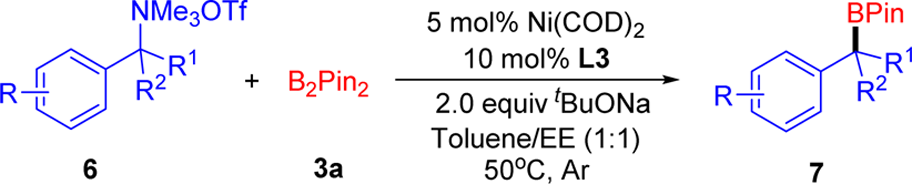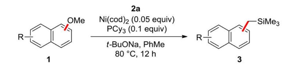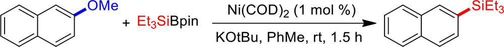 2018年Jain等人報道了在Ni(cod)2催化下萘甲醚和Et3SiBpin進C-O活化的偶聯反應得到萘硅烷。