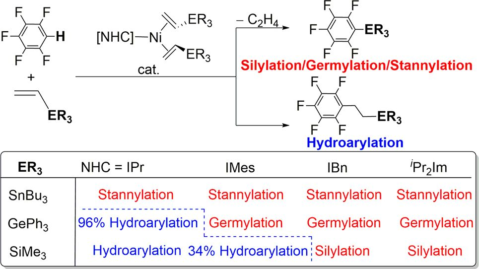 近期,M. R. Elsby等人報道了,Ni(COD)2和NHC配體催化的C6F5H 和H2C=CHER3 (ER3 = SnBu3, GePh3, SiMe3) C-H活化反應,NHC配體空間位阻對C-E鍵形成和氫芳基化反應的選擇性影響很大。