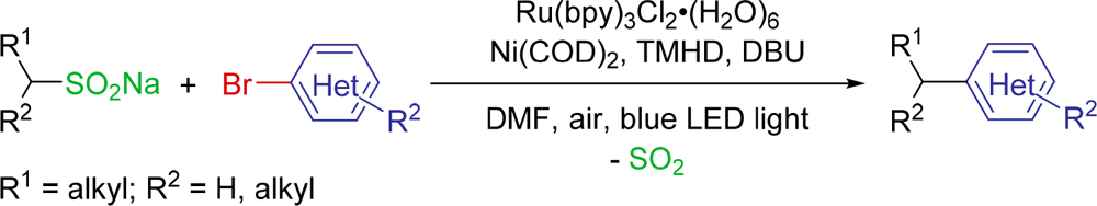 2017年Thomas Knauber等人報道了,在Ru(bpy)3Cl2和Ni(COD)2雙催化劑催化下,烷基亞磺酸鹽和芳基鹵代物進行Csp2?Csp3脫亞磺酰基光氧化還原交叉偶聯反應。