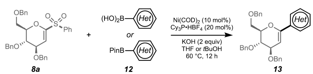 最近,四川大學的鈕大文教授利用Ni(COD)2 和Cy3P·HBF4催化下,通過鎳催化的Suzuki-Miyaura交叉偶聯反應實現α-氧-乙烯基砜與芳基硼化合物的偶聯,碳-砜鍵在這些反應中可以很好化學選擇性地裂解,可以高產率制備C-芳基烯糖類化合物或非環乙烯基醚。此反應可在溫和條件下進行,并且對于各種雜環和官能團有著良好的耐受性。