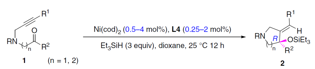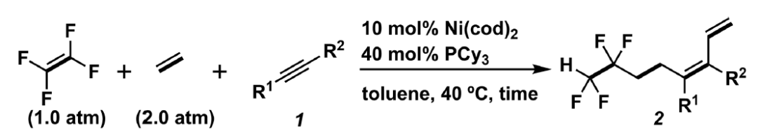 2017年,Takuya Kawashima等人報道了在Ni(cod)2和PCy3催化下,四氟乙烯,炔烴,乙烯高選擇性的進行交叉四聚反應制備各種含有3,3,4,4-四氟丁基鏈的1,3-二烯類化合物的反應。