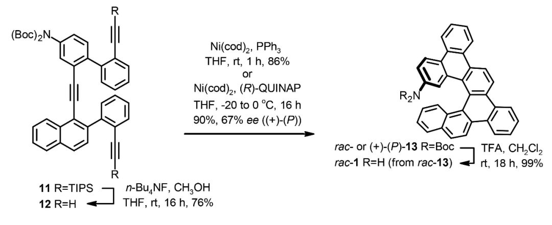2018年,M. Karras等人報道了在Ni(cod)2/(R)-QUINAP催化下非手性三炔進行對映選擇性[2 + 2 + 2]環異構化得到(+)-(P)-2-氨基二苯并[6]螺烯類化合物。
