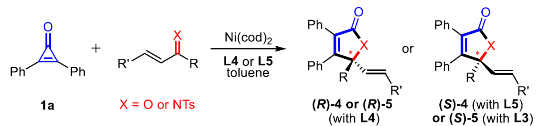 近期,陜西師范大學李興偉教授和河南師范大學白大昌副教授合作報道了Ni(cod)2催化下,環丙烯酮與α,β-不飽和酮/亞胺進行對映選擇性[3+2]環加成反應,該反應涉及環丙烯酮C-C鍵斷裂和羰基/亞胺基的對映選擇性官能團化,獲得高對映選擇性的γ-烯基丁烯酰胺和內酰胺衍生物。
